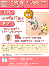 お知らせ トップページお知らせお知らせ健康講座「ロコモ、フレイル、サルコペニアとリハビリ」開催のお知らせ 健康講座「ロコモ、フレイル、サルコペニアとリハビリ」開催のお知らせ 2025/01/29 カテゴリー: お知らせ 2月27日(木)14時より、イオン八事店4F G.Gイベントコーナーにて健康講座を開催いたします。 今回は整形外科医師より、加齢により心身が弱ってきた状態を指す「ロコモ、フレイル、サルコぺニア」などについてその評価法や対策について解説し、ご自分でできるセルフチェックについてもご紹介いたします。参加費は無料です。多数のご参加をお待ちしております。詳細につきましては、下記画像をクリックしてご確認ください。 Tweet シェア prev病院広報誌「聖風23号」発行のお知らせ next2月の外来医師勤務表の公開について(1/30更新)