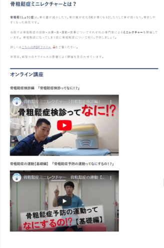 第一弾として、骨粗鬆症ミニレクチャーと糖尿病教室の動画を掲載しましたのでご活用ください。